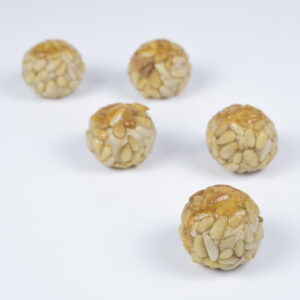 Riquísimas bolas de mazapán de almendra marcona recubiertas de piñón nacional. Se vende al peso, en paquetes de 250 gr, 500 gr, 750 gr. y 1Kg.
